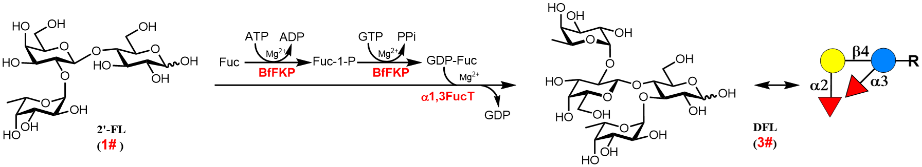Lee H J, Shin D J, Han K, et al. Simultaneous production of 2′‐fucosyllactose and difucosyllactose by engineered Escherichia coli with high secretion efficiency[J]. Biotechnology Journal, 2022, 17(3): 2100629.